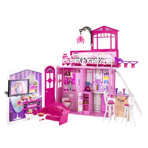 BARBIE® Glam Vacation House: Barbie® doll's fabulously glam vacation house is the ultimate in pinktastic play! Features 2 stories and 6 areas of glam-o-rama play including living room, bedroom, kitchen, bathroom, patio, and breakfast bar. Clip n' flipTM pieces such as TV, chandelier, and tiki lights can be arranged and rearranged around the house in different rooms for customization. Includes couch, bed, breakfast/patio bar and blender. Folds up super neat for glam play on the go! For ages 3 andAvailable at Amazon Check Price Now!