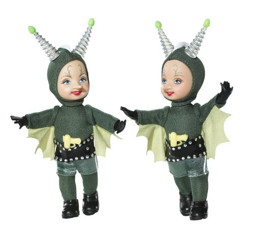 - Dolls feature green felt outfits with grommet effect trim and ray gun